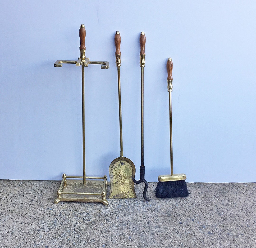 Vintage Fireplace Tool Set Wood Brass Plated Stand 3 Tools 4 Etsy